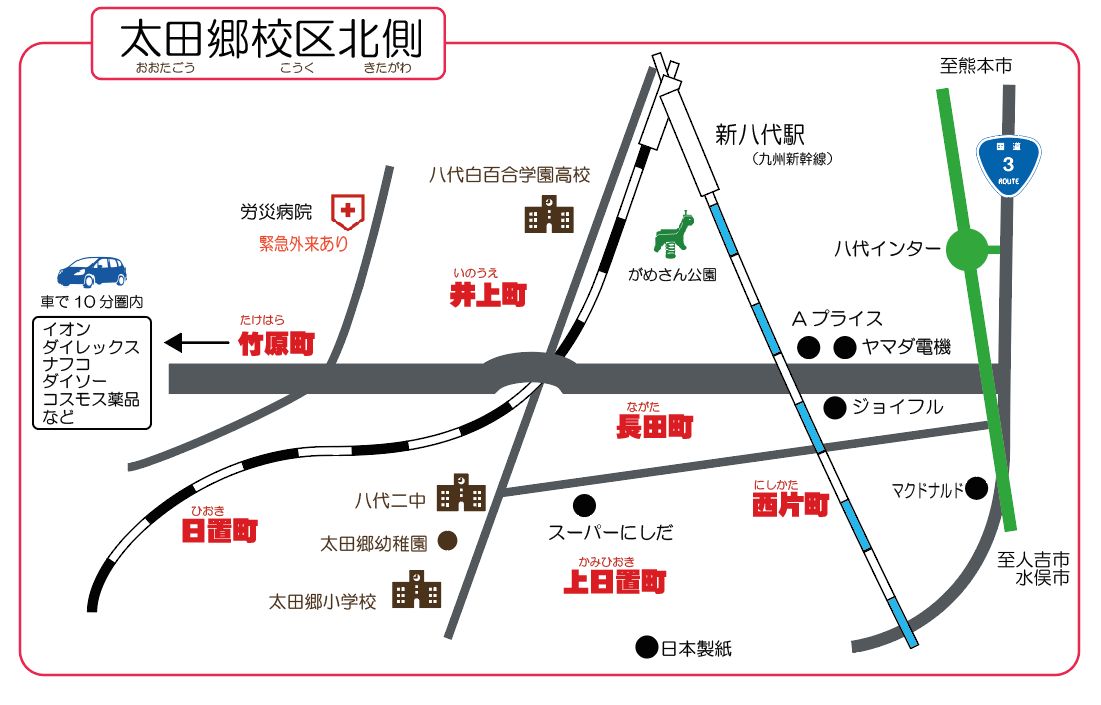 これから八代にお引越しの方に太田郷校区のご紹介をいたします。おすすめ地域は竹原町、井上町、日置町、長田町、上日置町、西片町。学校や病院が近く子育てがしやすい地域です。